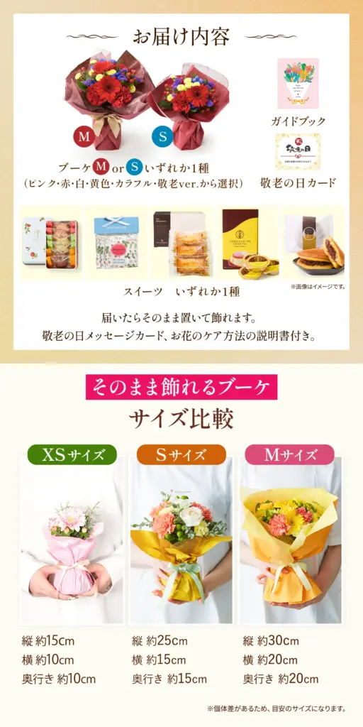 さらに「花とスイーツのセット」もあるので、甘いもの好きなおじいちゃん・おばあちゃんにはセットで贈ると二重に喜ばれると思います。